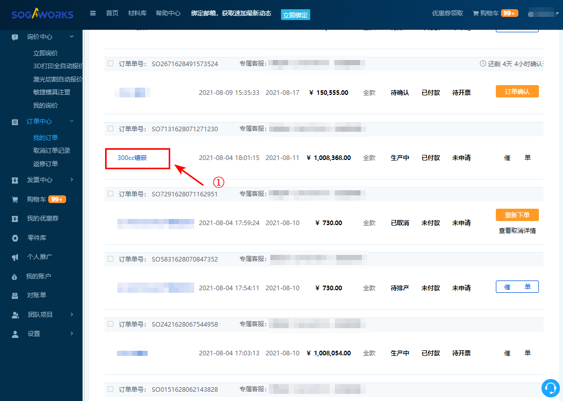 4. 點(diǎn)擊【零件名稱】,進(jìn)入訂單詳情頁(yè)面