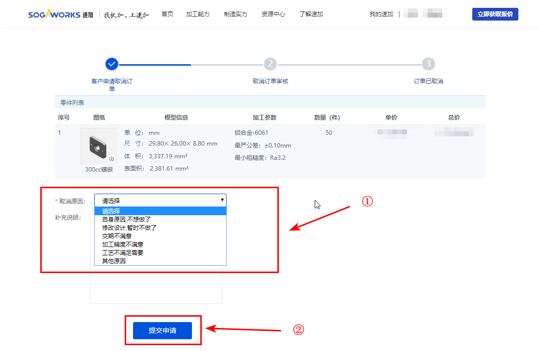 6. 按提示完善信息后,點(diǎn)擊【提交申請(qǐng)】,訂單取消申請(qǐng)成功